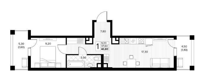 • Общая площадь 40.8 м²